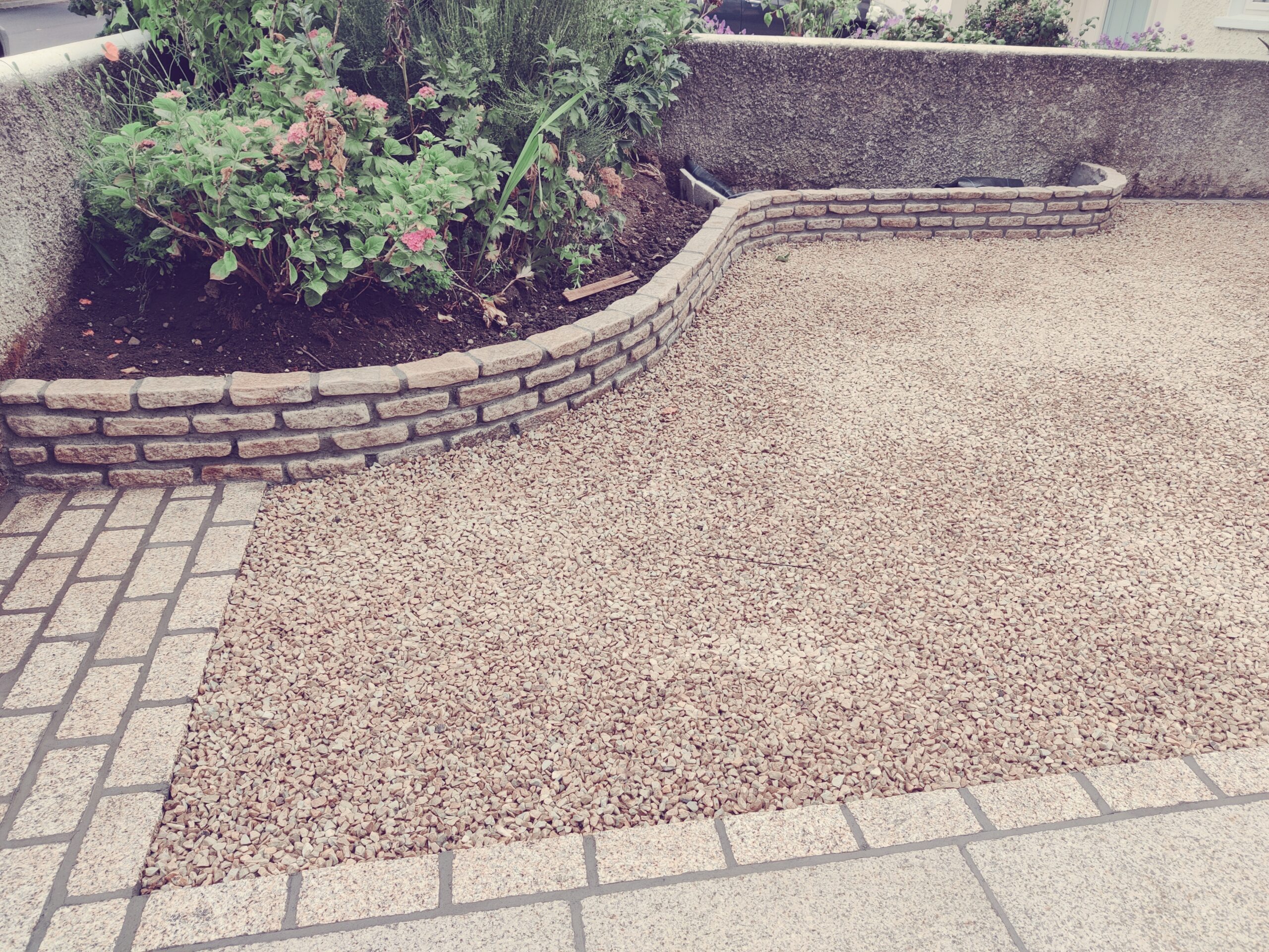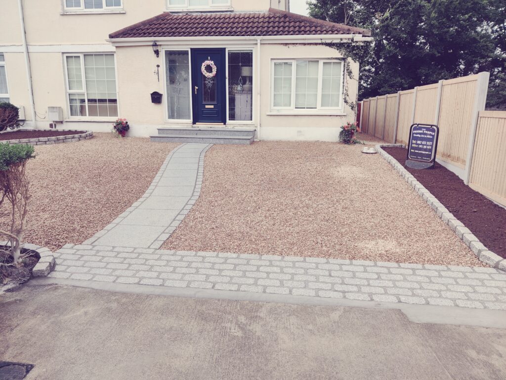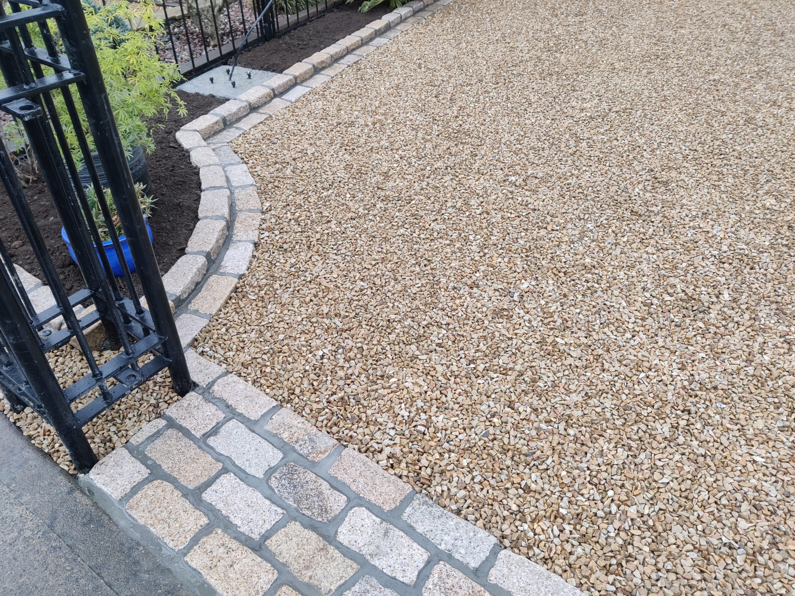 Recent gravel driveway project completed with granite apron, path and ready to plant flowerbeds.